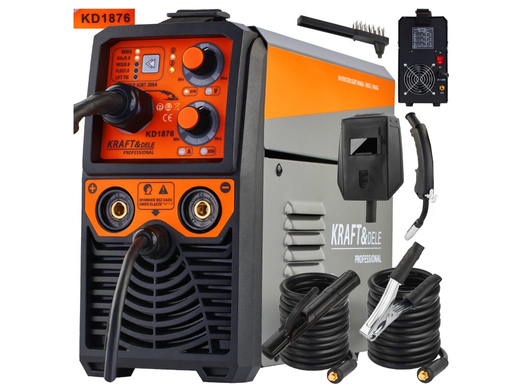 Aparat za zavarivanje MIG/MAG/MMA/FLUX KD1876, s univerzalnom primjenom, namijenjen zavarivanju nehrđajućeg čelika, legiranih metala, ugljičnog čelika, bakra i neželjenih kovina. Uređaj pogodan kako za kućnu, tako i za profesionalnu upotrebu.