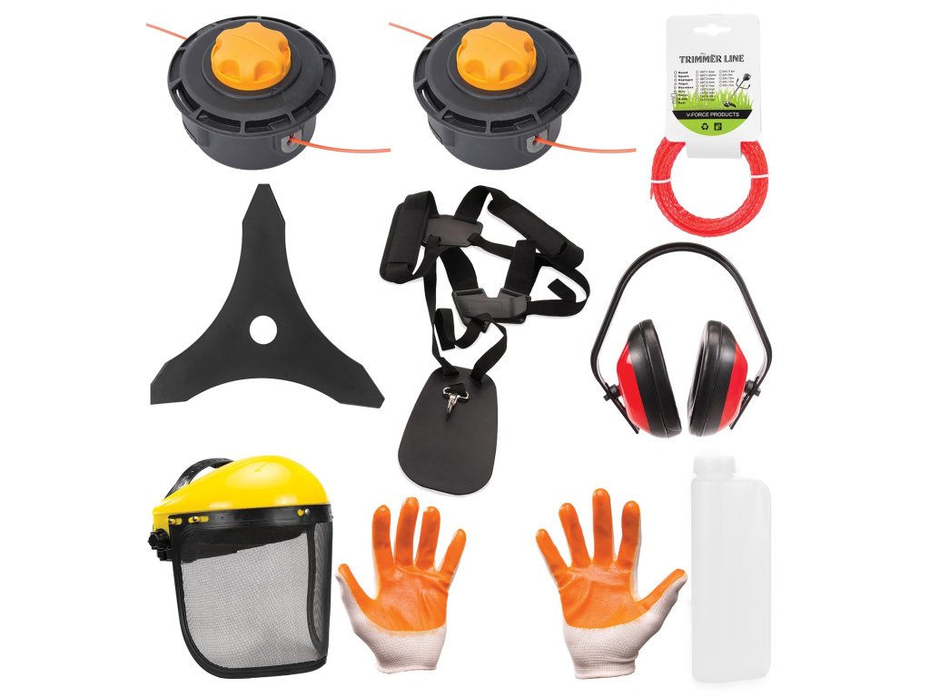 Set uključuje dva rezna glavice, koje su opremljene sustavom automata za ispuštanje žice nakon udarca o tlo.