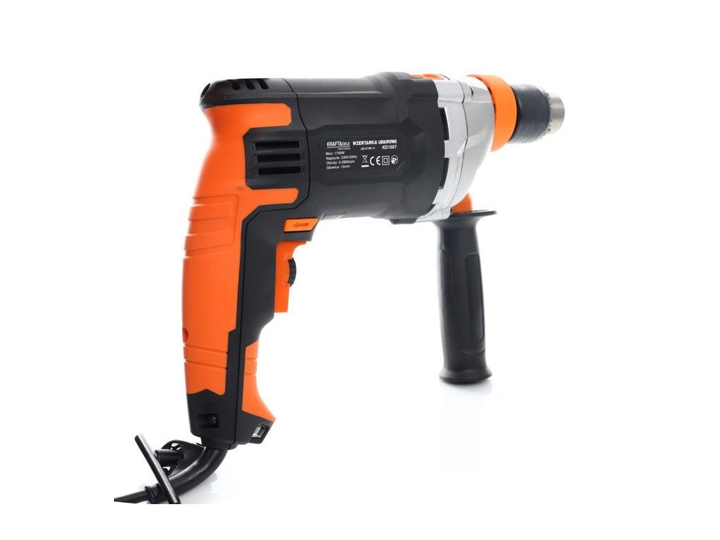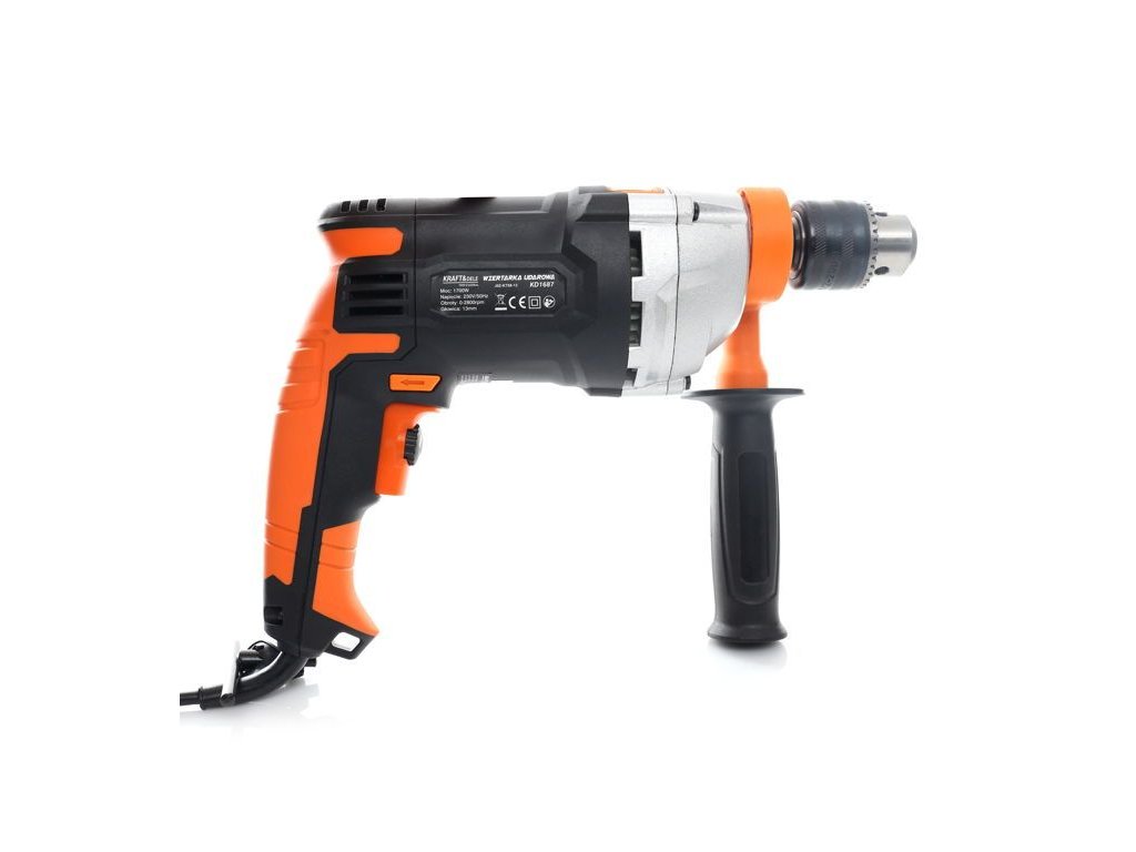 Električna udarna bušilica 1700 W KD1687 namijenjena je za udarno bušenje u zid, beton i kamen, kao i za bušenje u metalu, keramici, drvu i plastici. Glavna ručka je izrađena od posebnog protukliznog materijala, koji olakšava držanje alata u ruci. Radi se o verziji opremljenoj dodatnom bočnom ručkom. Glava je metalna.