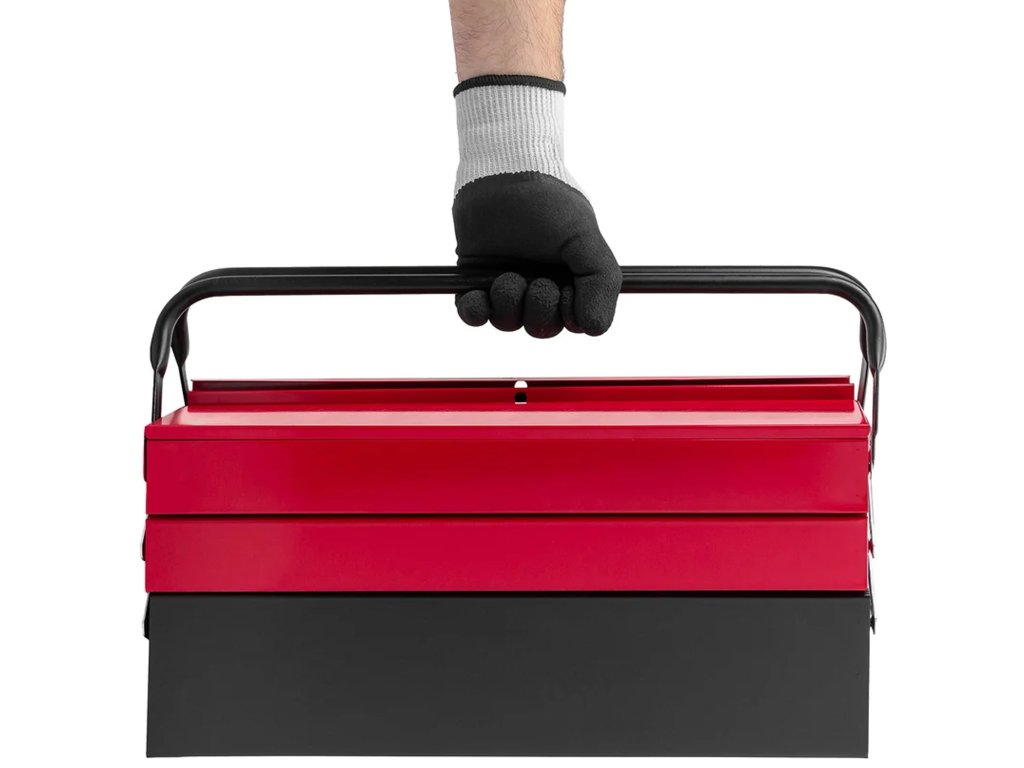 Kutija ne samo da štiti alate, već omogućuje i njihovo logično sortiranje. Zahvaljujući sklopivim policama, svi dijelovi su uvijek lako dostupni.