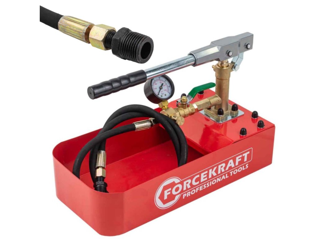 FORCEKRAFT pumpa za ispitivanje tlaka je precizni alat dizajniran za izvođenje ispitivanja tlaka i ispitivanja nepropusnosti u instalacijama, s mogućnošću korištenja vode ili ulja kao ispitne tekućine pri maksimalnom ispitnom tlaku od 70 bara .