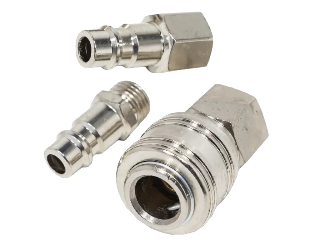 Profesionalni set pneumatskih brzih spojnica od 1/4" pouzdano je rješenje za svaku radionicu, servis ili korisnika koji radi s pneumatskim alatima. Set sadrži 3 elementa koji omogućuju brzo i čvrsto spajanje crijeva na alate ili uređaje.