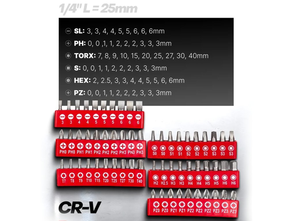 Set uključuje ravne, križne, Torx i četvrtaste odvijače te širok izbor bitova i nasadnih ključeva, pokrivajući gotovo sve uobičajeno korištene vrste vijaka i matica.