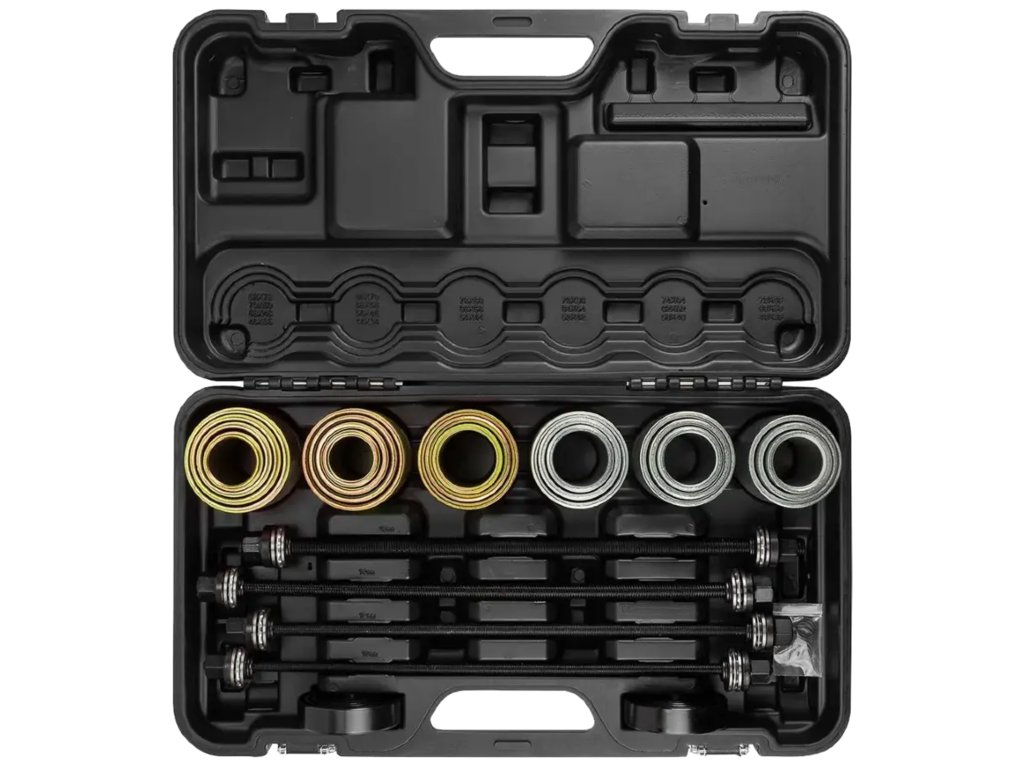 Profesionalni set od 26 dijelova za rad s čahurama, ležajevima i ramenima neophodan je alat u svakoj automehaničarskoj radionici i mehaničkom servisu. Zahvaljujući svojoj svestranosti i preciznoj izradi, omogućuje brze, sigurne i učinkovite popravke ovjesa i sustava montaže bez potrebe za hidrauličnom prešom.