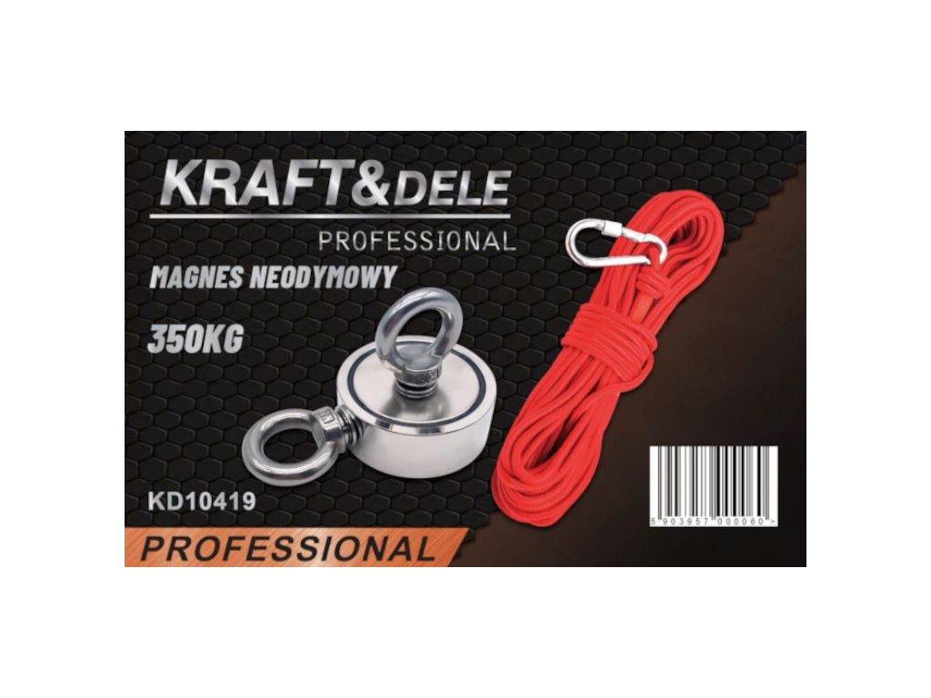 Magnetni držač s neodimskim magnetom 350 kg KD10419 – trajni magnet (stalan magnet) izrađen od legure neodimija, željeza i bora. Ovi magneti stvaraju vrlo snažno magnetsko polje, što se odražava na veliku privlačnu silu.