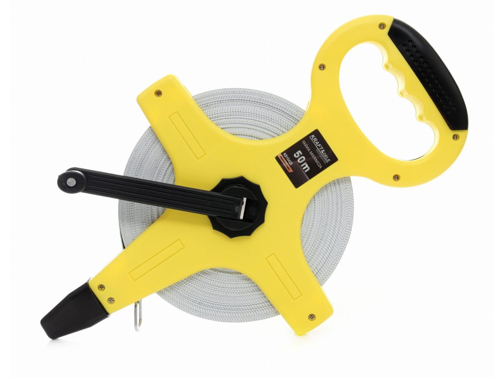 Profesionalna mjerna traka marke Kraft&Dele. Otporan kraj od materijala iz staklenih vlakana za zabijanje u tlo olakšava mjerenje bez pomoći. Korisno prilikom rada jednim operaterom jer na kraju trake nalazi se pričvršćena užad. Ergonomski dizajn osigurava udoban držač i glatko navijanje koluta.