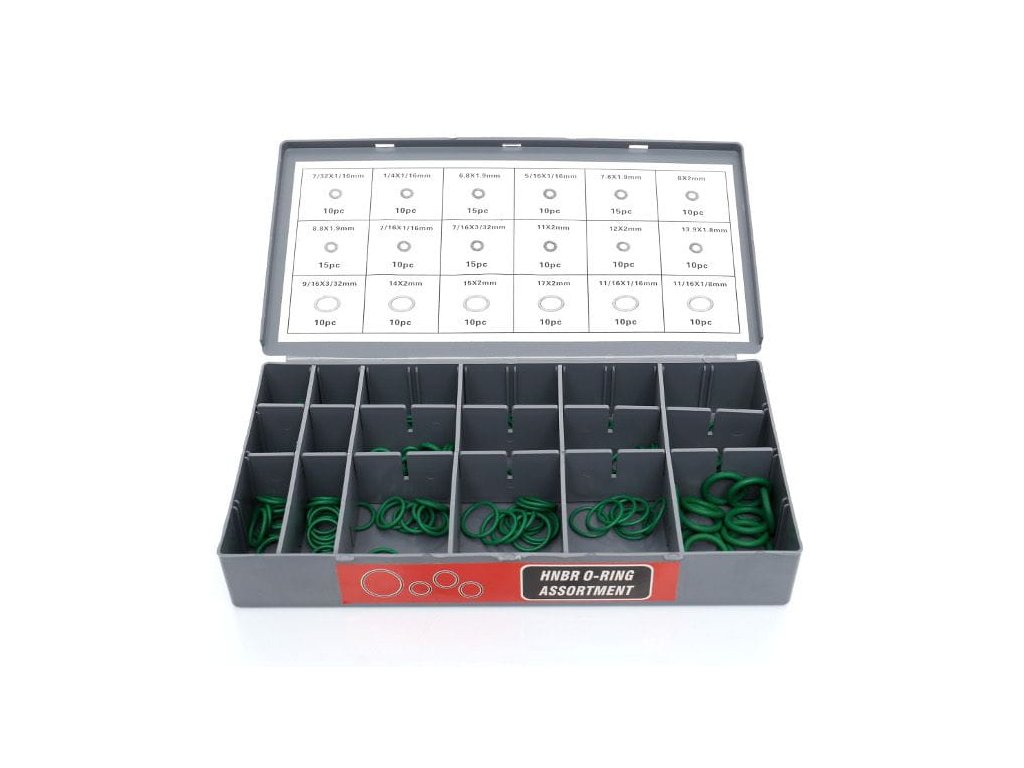 Cijeli set je zapakiran u plastičnu ambalažu, gdje svaka veličina O-prstena ima svoje označeno mjesto.
