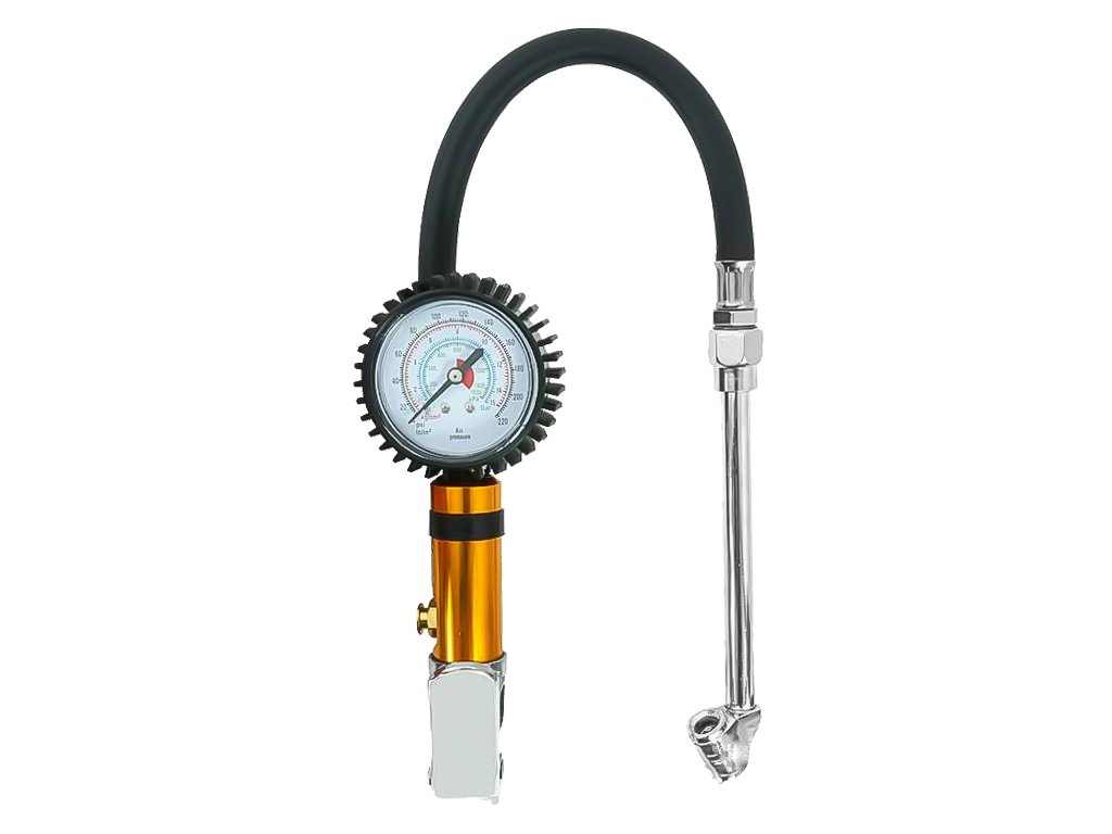 Pištolj za zrak s manometrom služi za napuhavanje i kontrolu pritiska u pneumatikama. Ima gumeni poklopac manometra. Opremljen je ventilom za ispuštanje zraka.