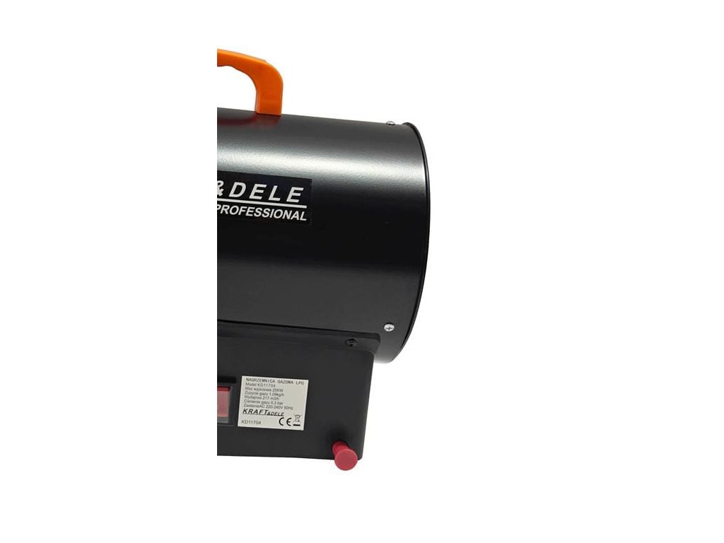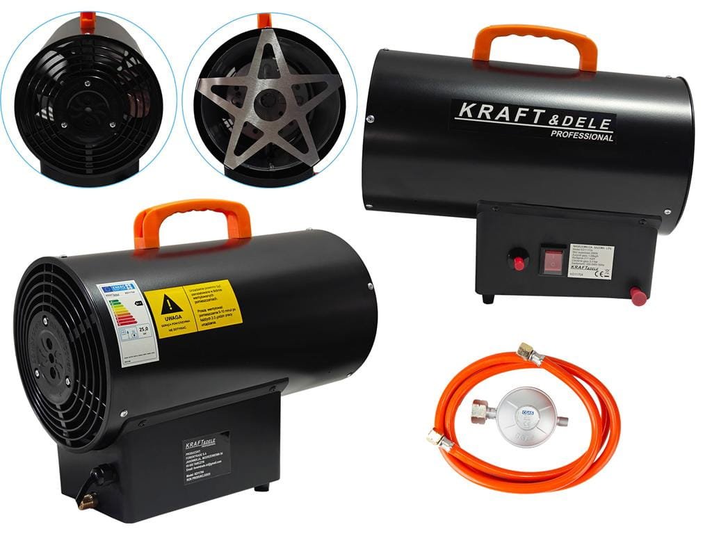 Grijač s ventilatorom marke Kraft&Dele model KD11704 s učinkovitošću 20 kW na plin propan-butan (LPG). Grijači s ventilatorom marke Kraft&Dele ubrajaju se među najbolje uređaje na tržištu u svojoj cjenovnoj kategoriji. Njihovu visoku učinkovitost pri maksimalnoj štednji goriva (plina) osigurava posebno dizajnirana spaljna komora.