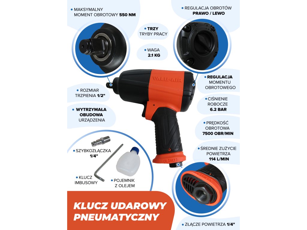 Pneumatski udarni ključ je snažan i profesionalan alat dizajniran za rad u vulkanizerskim poslovima i za kućnu upotrebu. Izvrstan je za otpuštanje i zatezanje vijaka kotača na raznim vrstama vozila. Zahvaljujući svojoj svestranosti, idealan je dodatak svakoj radionici.