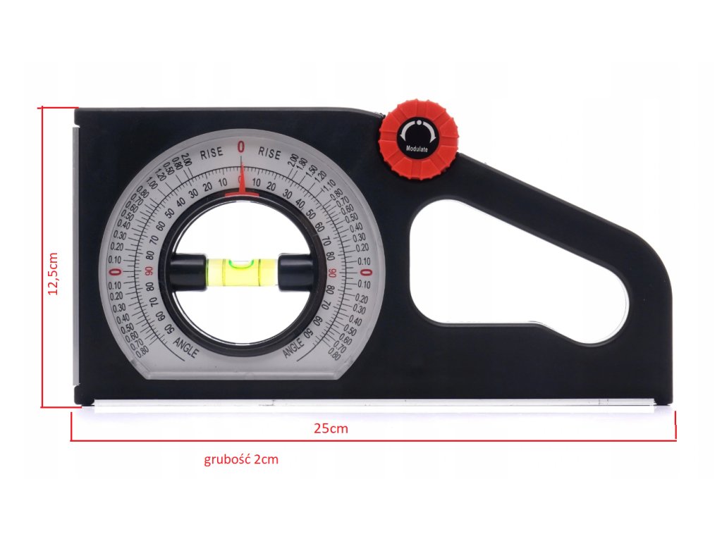 Podesivi kutnik, mjerač nagiba, goniometar, kutomjer je idealan alat za precizno mjerenje kutova i nagiba (padova / uspona). Ovaj uređaj je izvrsno prikladan za provjeru, montažu i postavljanje instalacija, što ga čini nezamjenjivim pomoćnikom za stručnjake u industriji.