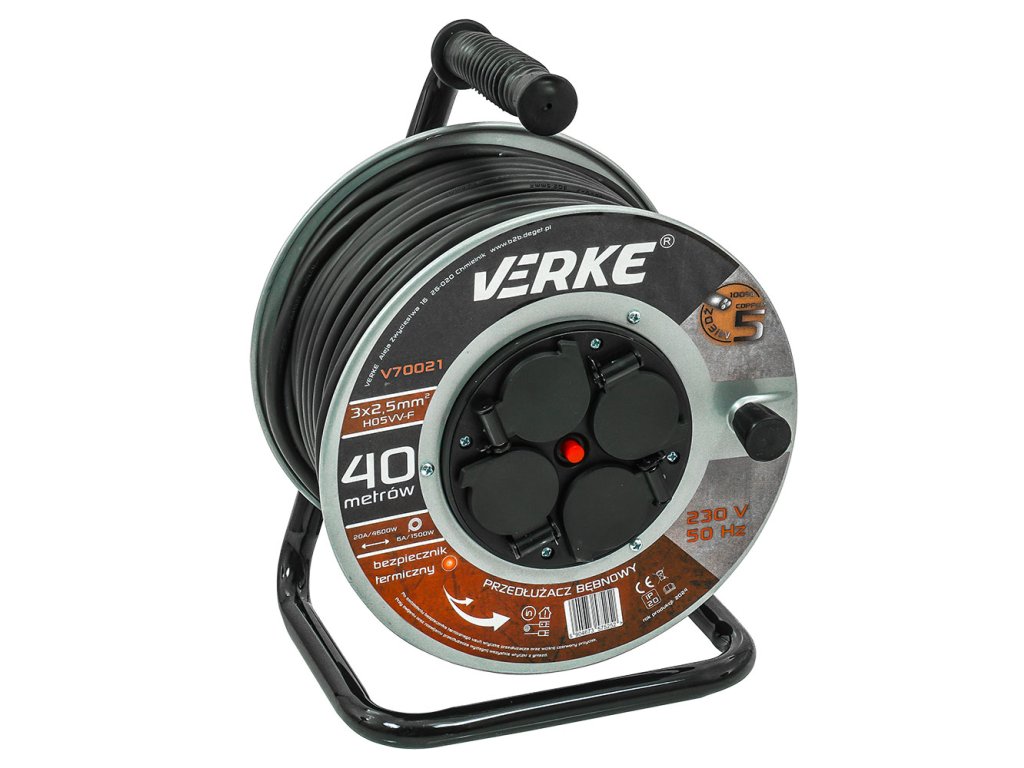 Visokokvalitetni produžni kabel na bubnju dužine 40 m s 4 utičnice. Kabel je izrađen od 3 bakrene žice promjera 2,5 mm² svaka. Ovaj promjer omogućuje povezivanje četiri uređaja istovremeno, što je posebno korisno na gradilištu ili u radionici.