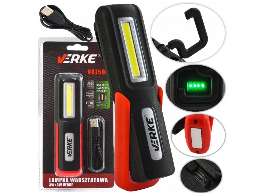 LED baterijska lampa s ugrađenim Li-ion akumulatorom i USB punjačem VERKE. Zahvaljujući upotrebi tehnologije LED COB (LED trakastog svjetla), lampa pruža znatno više svjetla u usporedbi s tradicionalnim tipovima i istovremeno je mnogo energetski učinkovitija. Zbog ergonomskog dizajna, uređaj čvrsto leži u ruci. Kapacitet akumulatora iznosi 1200 mAh. Lampa je opremljena indikatorom stanja baterije. Podesiva baza s ugrađenim magnetom i držač smješten na stražnjoj strani čine lampu vrlo svestranom i praktičnom za svakodnevnu upotrebu.