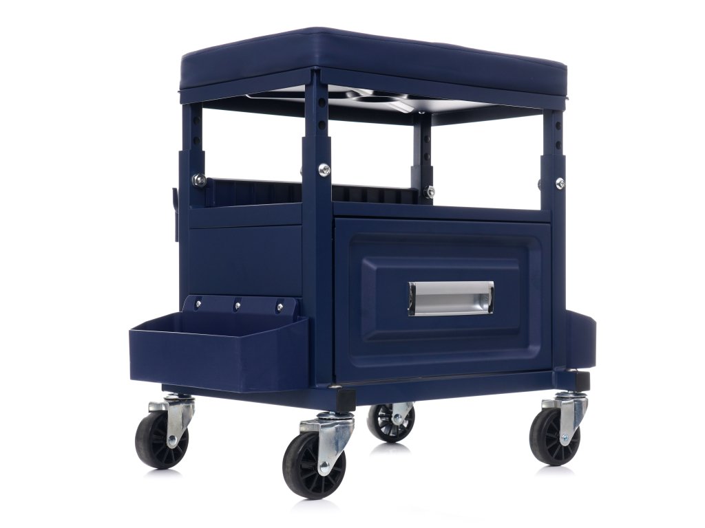 Radna stolica s ladicom KD10761 dizajnirana je za uporabu u profesionalnim radionicama, automehaničarskim servisima, servisnim radionicama te u kućnoj garaži. Opremljena je prostranom ladicom nosivosti oko 9 kg. Također ima 3 police na kojima se lako mogu pohraniti alati koji se koriste tijekom rada.
