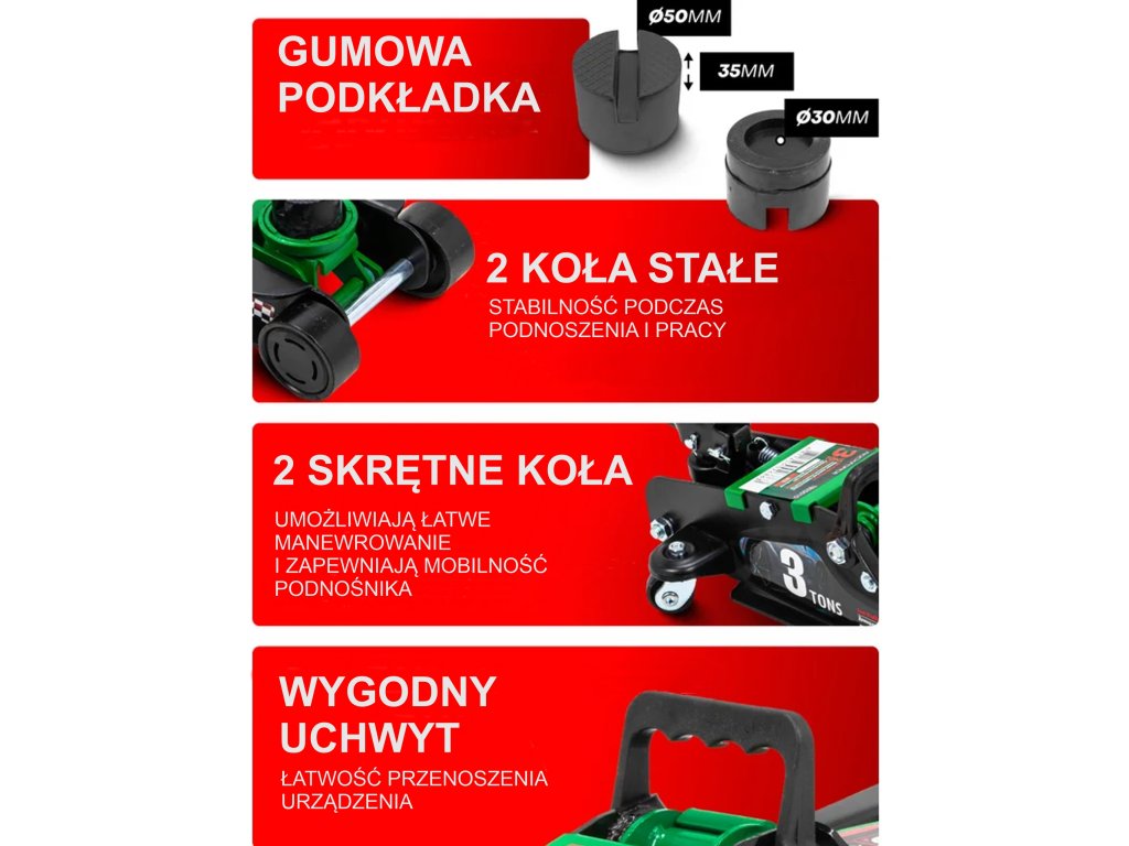 Preostala dva kotača su fiksna , što osigurava izvrsnu stabilnost prilikom podizanja vozila. Ova kombinacija pruža i mobilnost i sigurnost – dizalica se ne pomiče tijekom rada, ali se lako pomiče kada je posao završen.