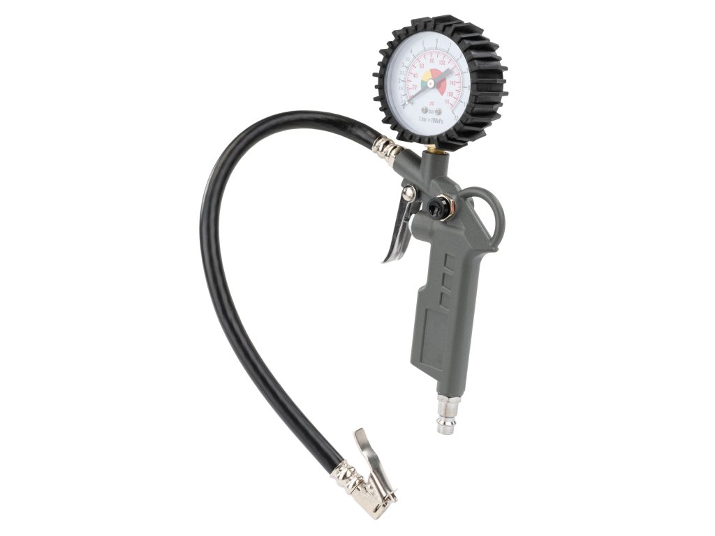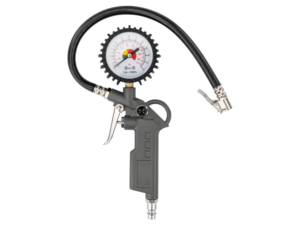 Pištolj za napuhavanje s manometrom osigurava precizno napuhavanje i kontrolu tlaka u gumama. Opremljen je gumenim kućištem i ventilom za ispuštanje zraka.