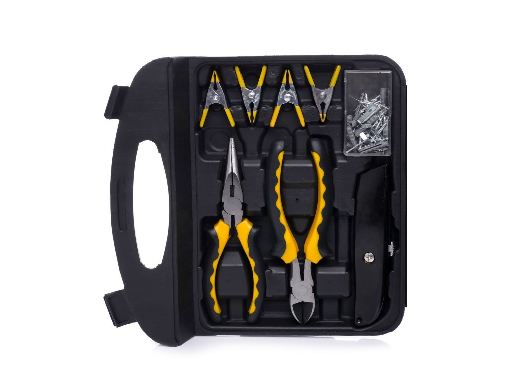 plosnate ključeve, nasadni ključevi, ratchet ključ, set kliješta, svorke, imbus ključevi, nož i također odvijače i bitove.