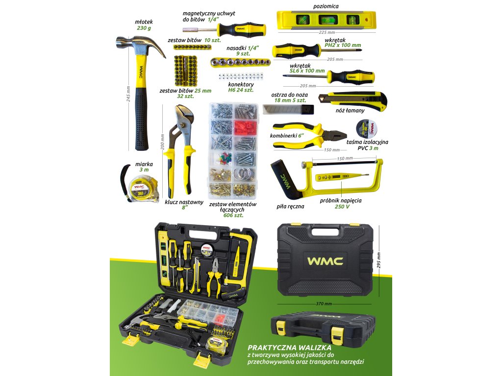 Asortiman WMC Tools uključuje odvijače, kliješta, ključeve, svrdla, pile, brusilice i mnoge druge alate, kao i specijalizirane setove i dodatke za profesionalne i hobi projekte. Svaki alat izrađen je s naglaskom na preciznost, dugotrajnost i jednostavnost korištenja, što omogućuje maksimalnu učinkovitost i udobnost pri radu.