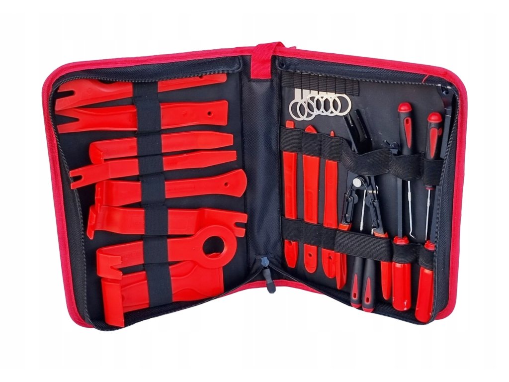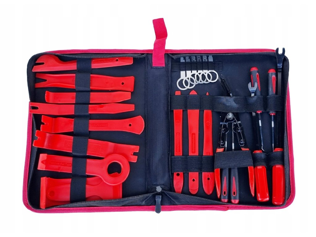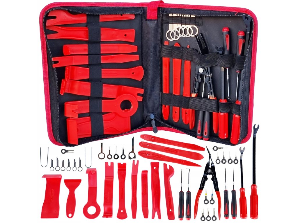 Ova set alata za demontažu obloga sadrži 43 specijaliziranih alata za sigurnu i učinkovitu demontažu obloga, letvica i drugih dijelova interijera automobila. Izrađeni su od izdržljivog najlona koji ne ostavlja ogrebotine niti oštećenja. Set je idealan za profesionalnu upotrebu u automehaničarskim radionicama, radionama za oblaganje ili prilikom popravaka karoserije i lakiranja. Alati su pakirani u praktičnu torbu koja omogućava jednostavno vješanje na zid.