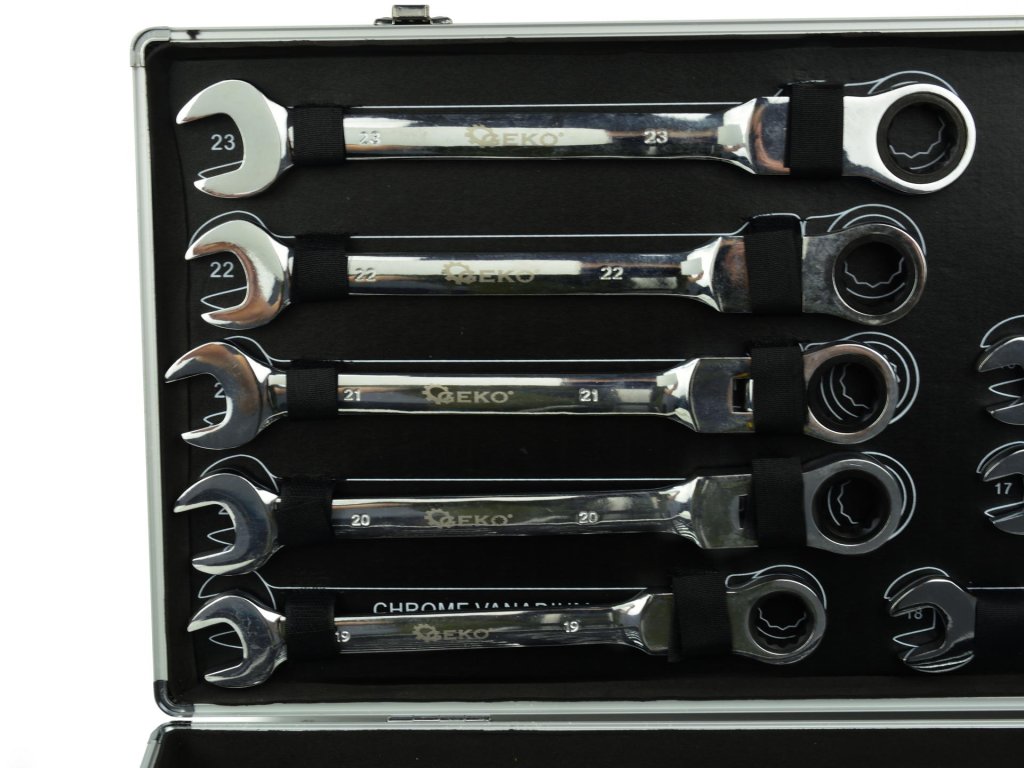 Set ključeva s čegrtaljkom 22 kom 6-32mm G10342 idealan je za profesionalne autoopravne i kućne garaže. Ova velika set plosnatih očkovih ključeva s 72-zubnim čegrtaljkom izrađena je od izdržljive krom-vanadijske čelika (CrV).