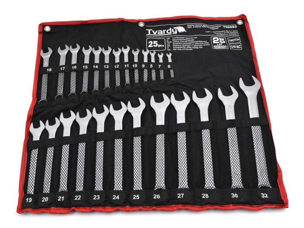Set kombiniranih ključeva od profesionalne marke alata TVARDY idealan je izbor za svakog majstora. Ova set sadrži 25 ključeva veličina 6-32 mm i izdržljivu platnu sa ojačanim rupama, koja omogućava jednostavno vješanje na zid.