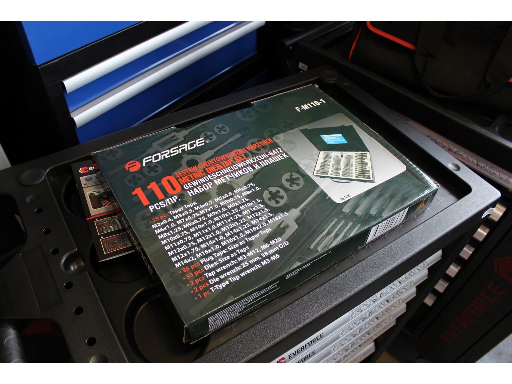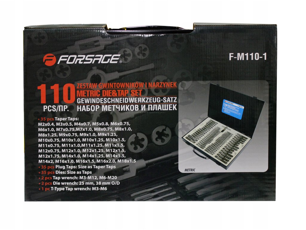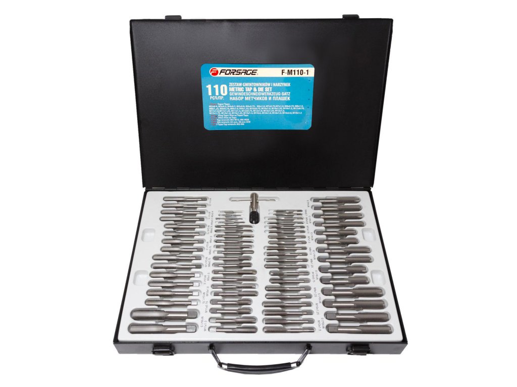 Visokokvalitetni FORSAGE set za rezanje navoja pohranjen u praktičnoj kutiji.