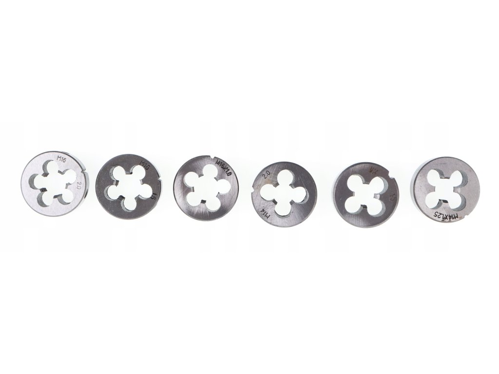 M2x0,4 mm; M3x0,5 mm; M4x0,7 mm; M5x0,8 mm; M6x0,75 mm; M6x1,0 mm; M7x0,75 mm; M7x1,0 mm; M8x0,75 mm; M8x1,0 mm; M8x1,25 mm; M9x0,75 mm; M9x1,0 mm; M9x1,25 mm; M10x0,75 mm; M10x1,0 mm; M10x1,25 mm; M10x1,5 mm; M11x0,75 mm; M11x1,0 mm; M11x1,25 mm; M11x1,5 mm; M12x0,75 mm; M12x1,0 mm; M12x1,25 mm; M12x1,5 mm; M12x1,75 mm; M14x1,0 mm; M14x1,25 mm; M14x1,5 mm; M14x2,0 mm; M16x1,0 mm; M16x1,5 mm; M16x2,0 mm; M18x1,5 mm
