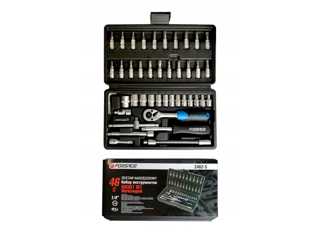 Set nasadnih ključeva od 1/4" sadrži 46 dijelova izrađenih od visokokvalitetnog krom-vanadij čelika. Set uključuje račvu s izdržljivim mehanizmom račve, širok izbor nasadnih ključeva (veličine 4-14 mm) i razne vrste bitova (ravni, križni, HEX, Torx). Dopunjuju ga nastavci uključujući fleksibilni, kardanski zglob, imbus ključevi, ručke i adapter za bitove.