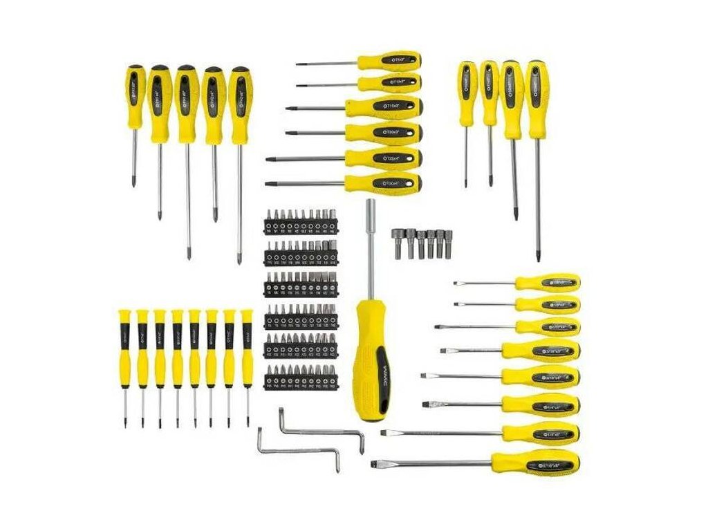 Praktični i dobro organizirani set od 100 odvijača , bitova, nasadnih ključeva i pribora, složenih u stabilnom stalku. Sadrži širok raspon ravnih, križnih, torx, kvadratnih i preciznih odvijača, zajedno s bitovima svih uobičajenih vrsta. Idealno za svakog majstora i profesionalca koji želi imati sve što mu je potrebno pri ruci.