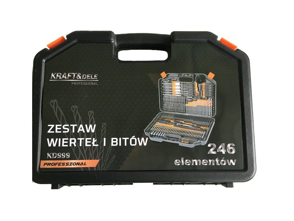 Set svrdla i bitova 246 komada KD999 – sveobuhvatni set alata marke Kraft&Dele. Alat odlikuje čvrsta izrada, otporni materijali i praktičan kovčeg u kojem svaki alat ima svoje mjesto. Set svrdla i bitova izrađen je od visokokvalitetnih materijala, uključujući krom-vanadijski čelik CrV. Vrtaljke za metal su od brzoreznog čelika HSS.