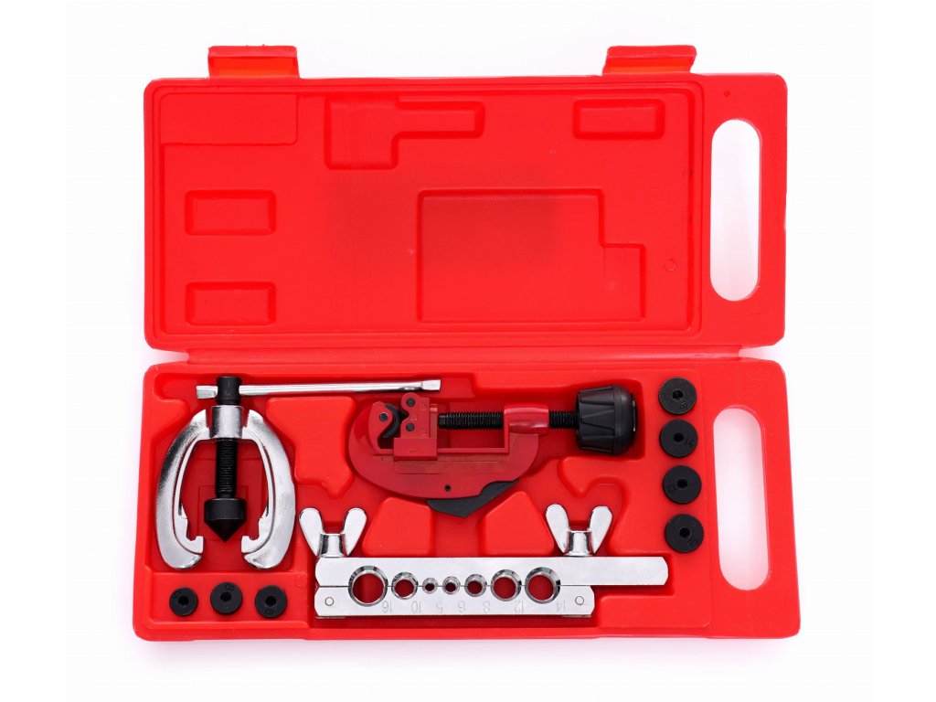 Set za povlačenje kočionih crijeva KD10545 – 10-dijelni set s rezačem marke Kraft&Dele, neophodan u svakoj radionici – set za spajanje aluminijskih i bakrenih kočionih crijeva i za izradu konusnih priključnih prirubnica.
