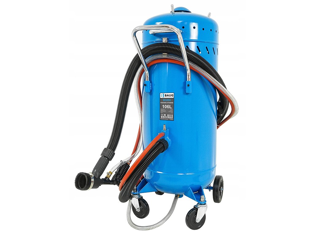 Bezprašni sifonski stroj za pjeskarenje s rezervoarom od 106 litara. Sifonski stroj omogućuje brzo i precizno čišćenje metalnih dijelova. Mobilni stroj za pjeskarenje omogućava pjeskarenje i čišćenje u poluotvorenoj cirkulaciji. Stroj je opremljen usisavanjem prašine pomoću usisavača koji, slično kao kod drugih uređaja poput bušilica, skuplja abraziv koji se odbija od površine koja se pjeskari te ga zatim vraća natrag u rezervoar s abrazivom. Pištolj za pjeskarenje je opremljen mlaznicom usisavača s četkom koja osigurava zapečaćen spoj i sprječava ispadanje abraziva. Funkcija usisavanja abraziva garantira urednost radnog prostora. Jednostavna, čvrsta konstrukcija rezervoara osigurava dugotrajnost i pouzdanost uređaja za pjeskarenje. Kotačići i dodatna, udobna ručka povećavaju lakoću transporta i ergonomiju korištenja. Karakteristične osobine ovog bezprašnog stroja za pjeskarenje su visoka radna učinkovitost i dinamičnost pjeskarenja.