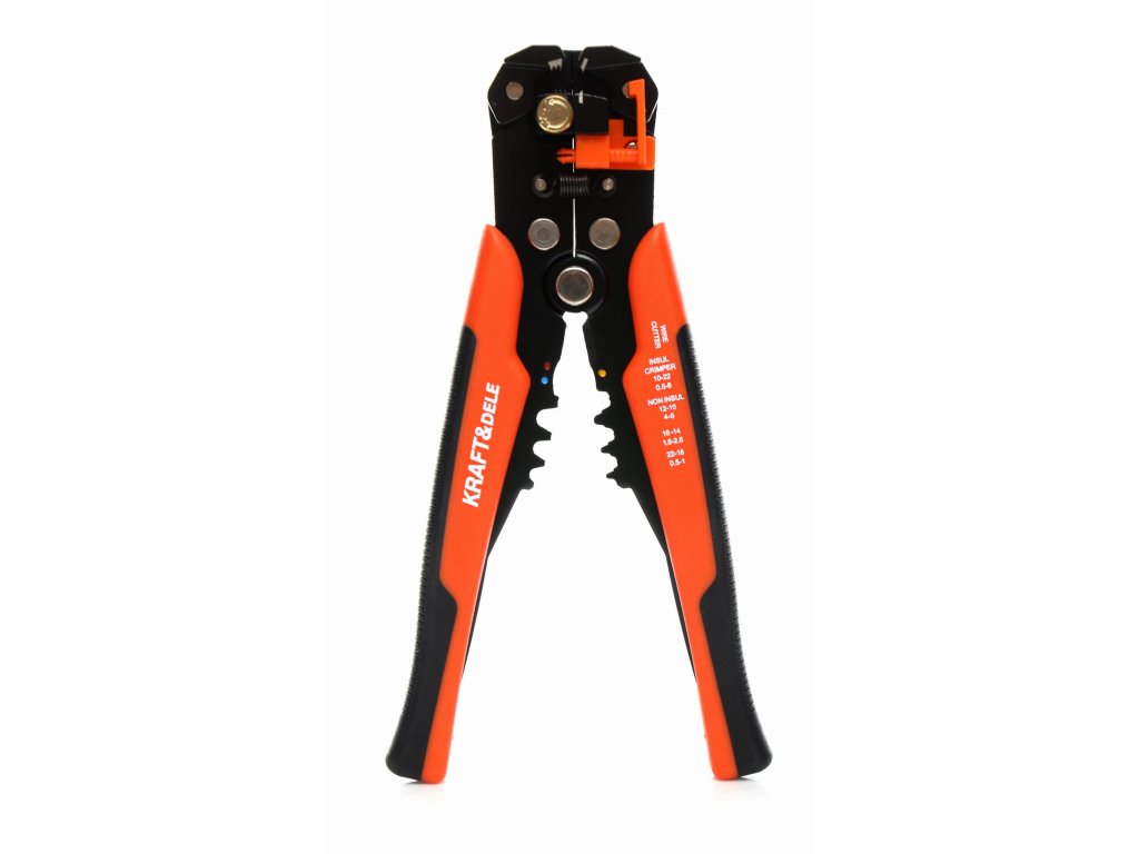 Skidač izolacije kabela i vodiča KD10535 je praktičan alat s širokim spektrom primjene. Jednostavno obrađuje vodiče s presjekom 0,2–6,0 mm², presač konektora od 0,5 do 6 mm i precizno odrezava izolaciju presjeka 0,5–2,5 mm². Opremljen je kaljenim oštricama, protukliznom gumom, automatskim prilagođavanjem presjeka vodiča, rezačkom, lisom za konektore i postavljanjem duljine odizoliranog dijela. Kompaktan (205 mm) i lagan (0,30 kg) s automatskim vraćanjem u početni položaj osigurava udoban i učinkovit rad.