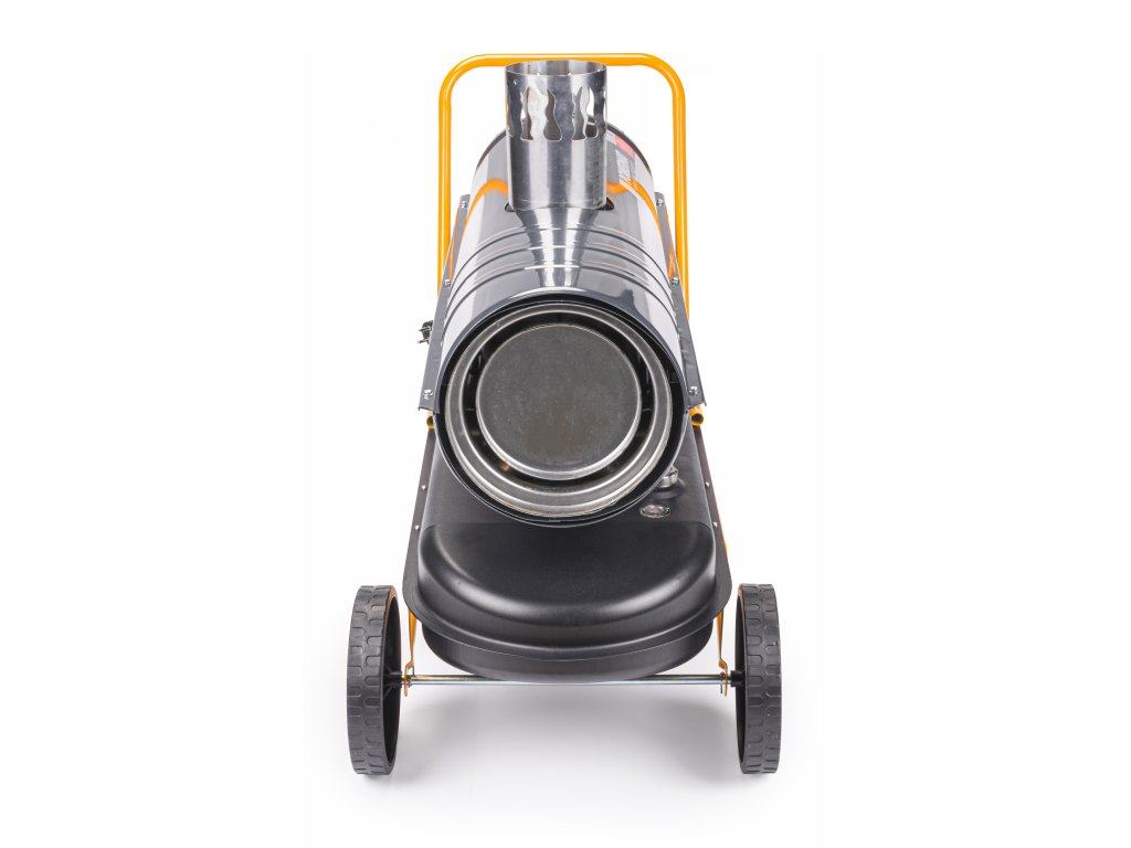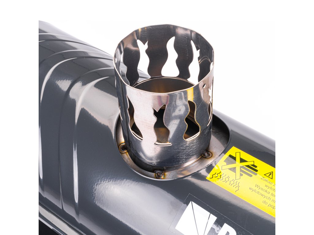 Plamen zagrijava izmjenjivač topline, a ispušni plinovi se odvode van putem dimnjaka u gornjem dijelu kućišta. Toplinska energija prenosi se zrakom koji okružuje izmjenjivač i izduvava se iz grijača u obliku stabilnog toka čistog i vrućeg zraka.