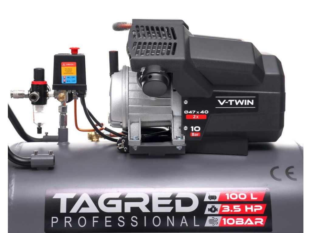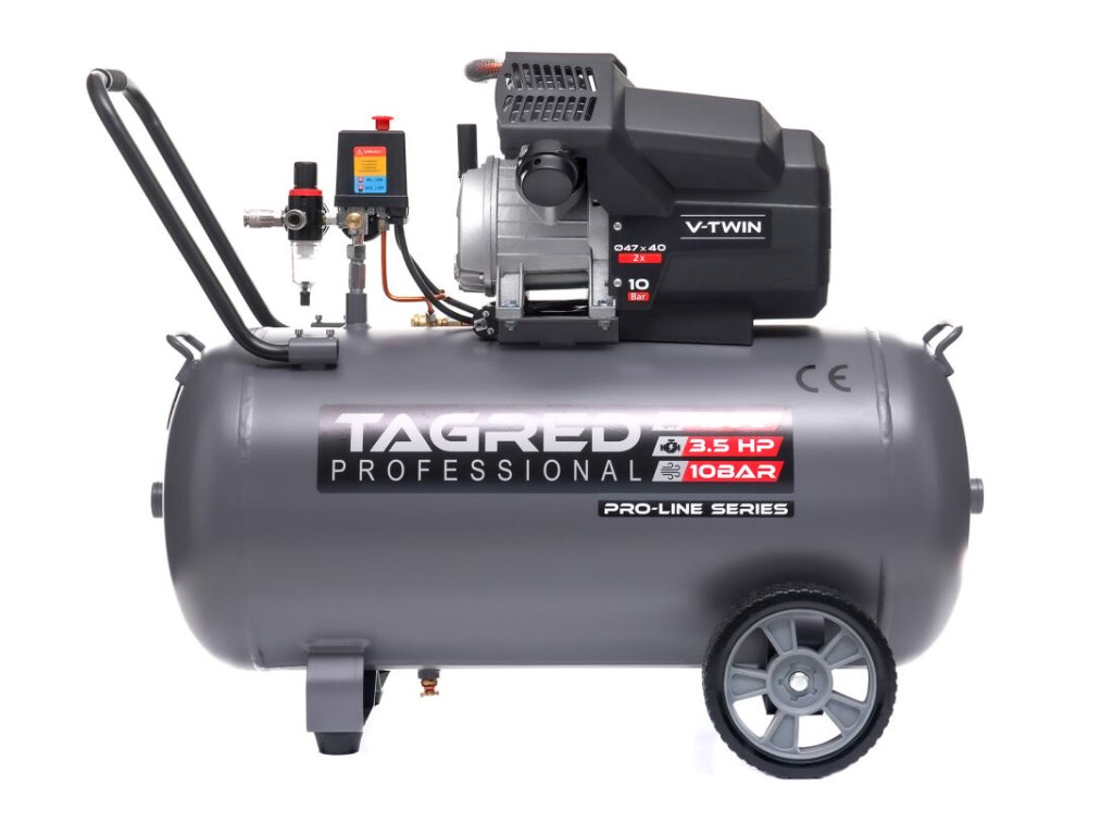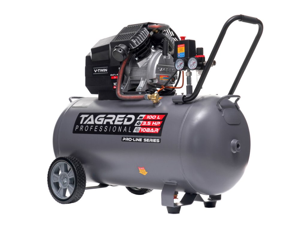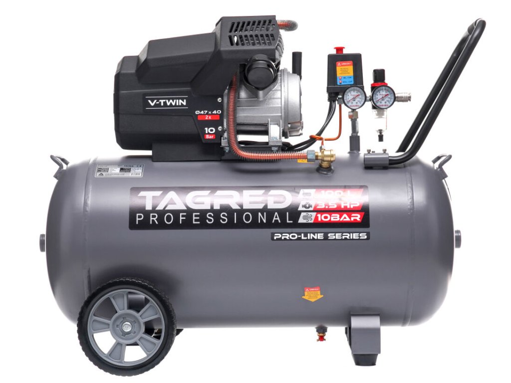 Snažan uljni kompresor TAGRED Pro-Line robusan je i pouzdan uređaj namijenjen intenzivnom radu u radionici, garaži i za kućnu upotrebu. Zahvaljujući dvoklipnoj konstrukciji, velikoj snazi i maksimalnom tlaku od 10 bara, pruža stabilnu opskrbu komprimiranim zrakom za širok spektar pneumatskih alata. Kvalitetna izrada, snažan motor i učinkovit sustav hlađenja osiguravaju dug životni vijek čak i pri dugotrajnom opterećenju.