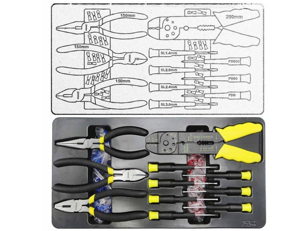 Set uključuje širok izbor alata za razne namjene: nasadne ključeve, kliješta, bitove, čekić, škare, libelu, mjernu traku, izolacijsku traku, set pričvršćivača i još mnogo toga.